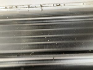 分解してみると、熱交換器はホコリが少し被っており、ファンなどはカビやホコリで汚れておりました!ただ、熱交換器も汚れが酷くないように見えて洗浄すると汚れております!
