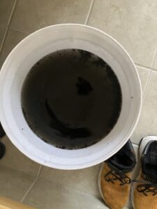 洗浄後です。汚水も真っ黒です。熱交換器とファンから出た汚れたちです。ファンも熱交換器もしっかりときれいになりました!
