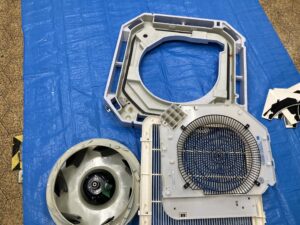 熱交換器から出てきた汚水は真っ黒でした!部品と熱交換器はしっかりと綺麗になりました!