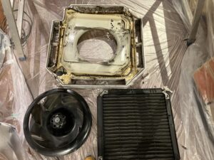 早速分解してみると…よごれ具合が大変なことになっておりました…取付をしてから一度もエアコンクリーニングをしたことがなく去年あたりから水漏れみたいなのも起きていたそうです。ここまで汚れてしまうとエアコン自体が故障してしまう原因にもなりかねません!