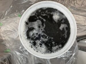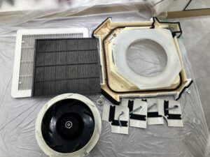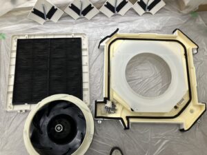 熱交換器からの汚れは予想通りですね!真っ黒な汚水が出てきました。臭いの原因のカビとホコリやバクテリアの汚れたちです!部品も、しっかりとカビキラーなども用いて綺麗にさせていただきました!