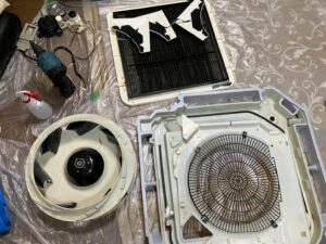 熱交換器は、専用の環境と素材に優しい洗剤を使用し汚れを除去させていただきました。部品なども、カビ除去剤を使用し綺麗にさせていただきました。