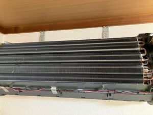 分解もしてみると、内部は大変な状態でした…熱交換器はカビだらけ、ファンとその内部はカビとホコリなどで汚れておりました!ファンも元々の色は白色だったのでしょうか面影を残しつつ真っ黒になっておりました。